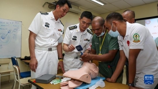 中國海軍“和平方舟”號(hào)醫(yī)院船派出醫(yī)療專家分隊(duì)赴東帝汶國立醫(yī)院進(jìn)行ACLS培訓(xùn),醫(yī)院船醫(yī)療專家為當(dāng)?shù)蒯t(yī)護(hù)人員進(jìn)行實(shí)操講解(9月5日攝)。新華社記者 黎云 攝