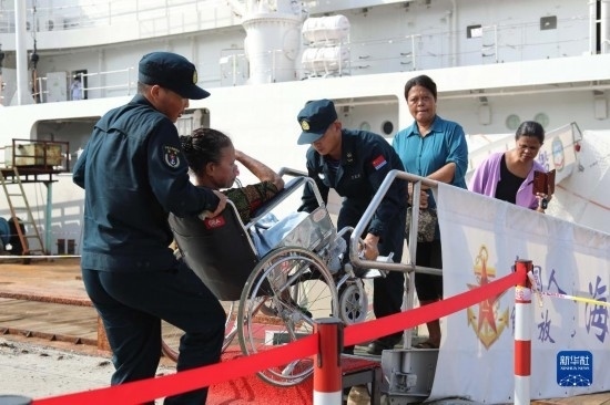 中國海軍“和平方舟”號(hào)醫(yī)院船訪問東帝汶并開展醫(yī)療服務(wù)期間,醫(yī)院船官兵為當(dāng)?shù)匦袆?dòng)不便的患者服務(wù)(9月6日攝)。新華社發(fā)(桂江波 攝)