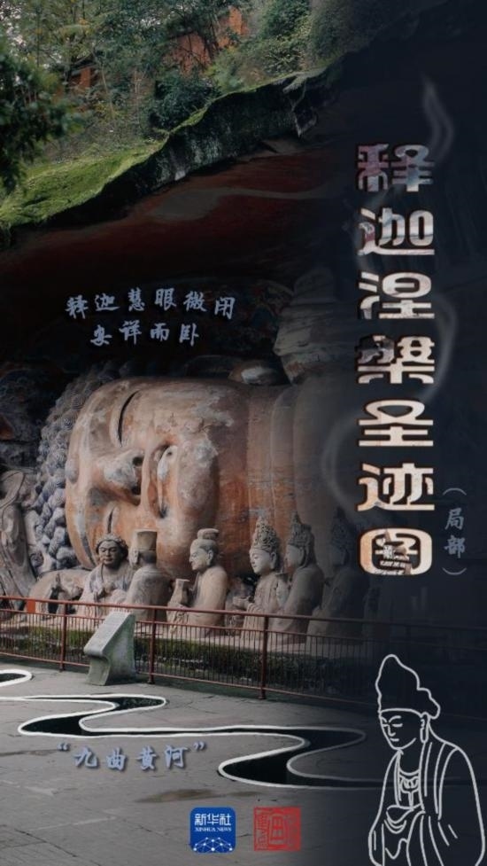 釋迦涅槃圣跡圖龕高7米、寬32米、深5米,刻像37尊。釋迦慧眼微閉,安詳而臥。佛像雙腳隱入巖際,右肩陷于地下,以有限的畫面表現(xiàn)了無限的藝術(shù)形象。