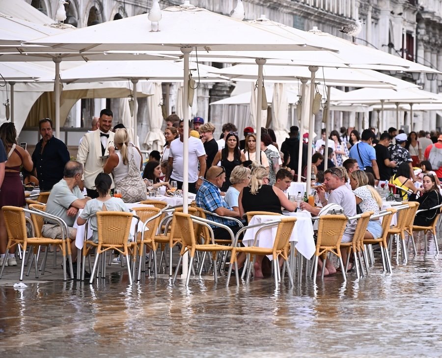 當(dāng)?shù)貢r間2023年8月4日,意大利威尼斯,游客在圣馬可廣場餐廳。