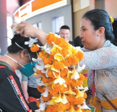 在印度尼西亞巴厘島伍拉萊國(guó)際機(jī)場(chǎng),工作人員為中國(guó)游客佩戴迎賓花環(huán)。新華社記者 徐 欽攝