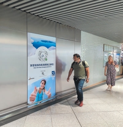 希臘雅典國(guó)際機(jī)場(chǎng)內(nèi),旅客走過(guò)用中文書(shū)寫(xiě)的廣告海報(bào)。本報(bào)記者 謝亞宏攝
