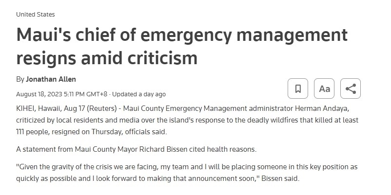 路透社8月18日?qǐng)?bào)道,毛伊縣緊急事務(wù)管理機(jī)構(gòu)負(fù)責(zé)人赫爾曼·安達(dá)亞在當(dāng)?shù)鼐用窈兔襟w的一片“救災(zāi)不利”的譴責(zé)聲中辭職。截至17日,致命山火已經(jīng)造成至少111人死亡。一些毛伊島居民認(rèn)為,如果能更早拉響警報(bào),會(huì)挽救更多生命。