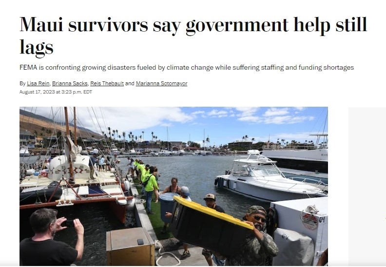 《華盛頓郵報(bào)》8月17日發(fā)表報(bào)道批評(píng)稱,政府救援仍然滯后,一些毛伊島幸存者仍在艱難地尋求住所和日常生活必需品。