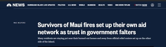 《紐約時(shí)報(bào)》8月14日?qǐng)?bào)道,聯(lián)邦緊急事務(wù)管理局要求人們?cè)诰W(wǎng)站上注冊(cè)后才能獲得臨時(shí)住房等援助,但是毛伊島西部受災(zāi)最嚴(yán)重地區(qū)目前依然處于斷電斷網(wǎng)中,那里的災(zāi)民根本無(wú)法登錄網(wǎng)站。