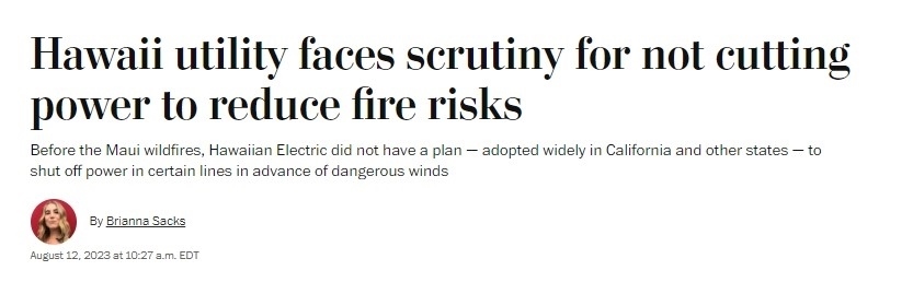 據(jù)《華盛頓郵報(bào)》8月12日?qǐng)?bào)道,三家法律公司已代表受害者對(duì)夏威夷電氣公司提起集體訴訟,指控該公司未在強(qiáng)風(fēng)天氣來(lái)臨前切斷供電。該公司下屬的一個(gè)變電站8日曾出現(xiàn)電線倒塌事故,事發(fā)地點(diǎn)靠近最初起火點(diǎn)。