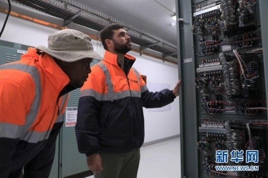 8月10日,在南非北開普省德阿鎮(zhèn),當(dāng)?shù)鼐用瘛⒆冸娬竟ぷ魅藛T達斯溫·巴松(左)與變電站副主管雷加特·范滕德在龍源南非公司德阿風(fēng)電項目變電站工作。新華社記者 董江輝 攝