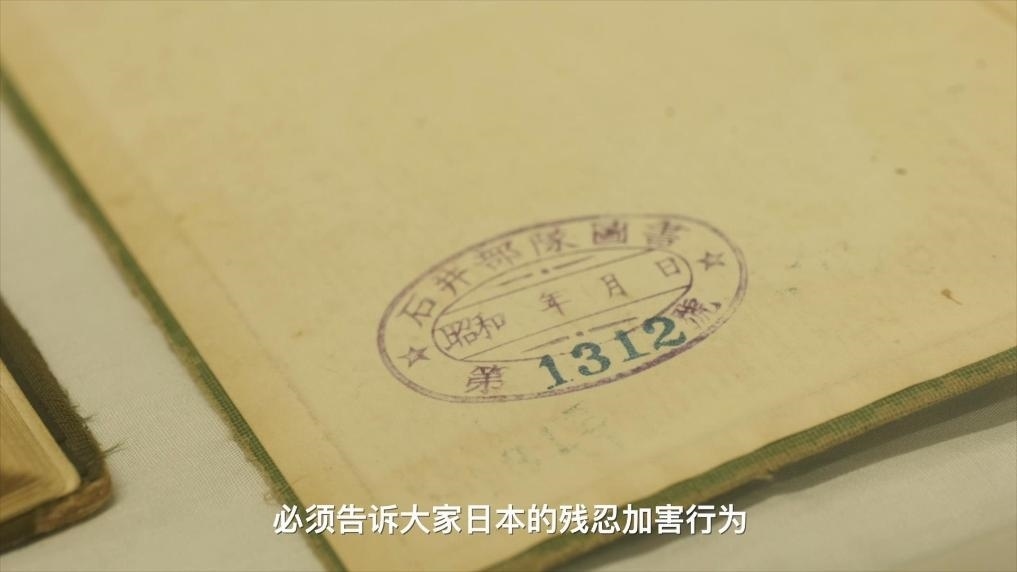 圖為飯?zhí)锸泻推狡砟铕^展廳內(nèi)展出的蓋有“石井部隊(duì)”印章的《人體解剖學(xué)》書(shū)籍內(nèi)頁(yè)。(視頻截圖)