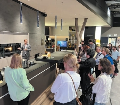 在2022年柏林國際消費(fèi)電子展期間,參觀者在卡薩帝展臺(tái)前了解智能廚房設(shè)備。本報(bào)記者 李 強(qiáng)攝