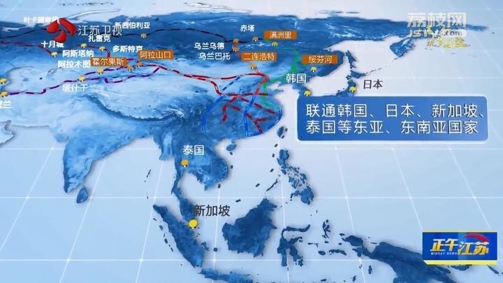 在東端,聯(lián)通韓國(guó)、日本等東亞國(guó)家以及新加坡、泰國(guó)等東南亞國(guó)家。