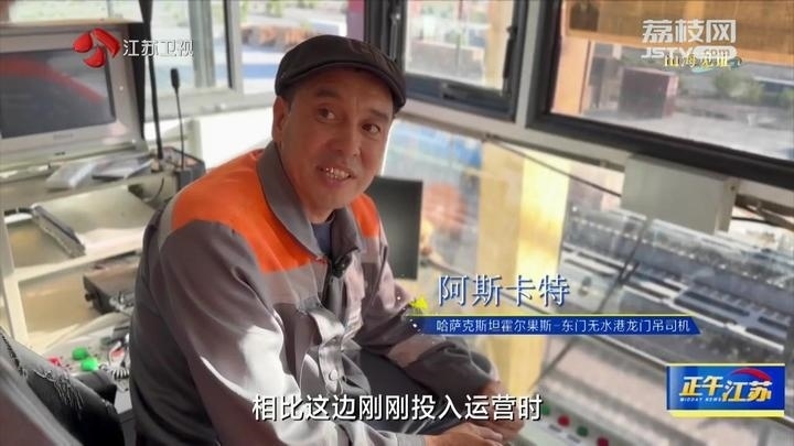 今年40多歲的阿斯卡特,正在十幾米的高空熟練操縱著巨型龍門吊,將剛剛抵港的集裝箱吊上新車板。十年前,無(wú)水港剛剛落成的時(shí)候,有著換裝工作經(jīng)驗(yàn)的阿斯卡特就被招募過(guò)來(lái)。他見證著這里因?yàn)橹袣W班列不斷興旺,從無(wú)人區(qū)成為口岸新城,基地里也從最初的五六個(gè)當(dāng)?shù)厝说浆F(xiàn)在有了180多個(gè)同事。通過(guò)不斷學(xué)習(xí),阿斯卡特如今拿到了巨型龍門吊操作證。忙碌的時(shí)候,他幾乎全天待在這個(gè)小小的操作間里,每天裝卸200個(gè)集裝箱。