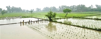 時(shí)值正午,驕陽(yáng)似火。在拉合爾西南郊的一處雜交水稻試驗(yàn)田里,來(lái)自中國(guó)湖南的農(nóng)業(yè)專家龍春久正在同當(dāng)?shù)剞r(nóng)民和技術(shù)員一起進(jìn)行雜交水稻選種試驗(yàn)。頭戴草帽,褲腳挽至膝蓋,龍春久在泥濘的水田里彎腰插秧,汗水從他黝黑的面龐上淌下。