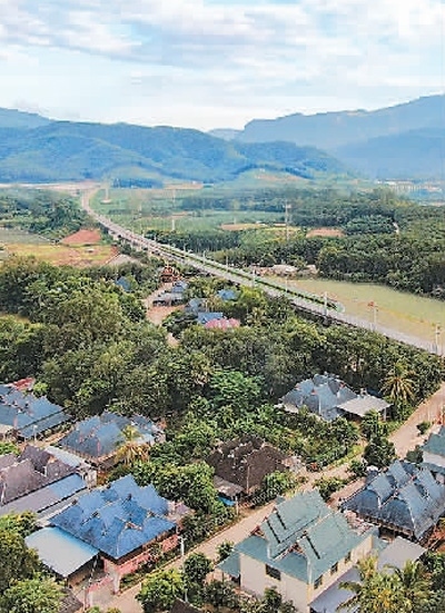 云南省景洪市勐罕鎮(zhèn),中老鐵路上的動(dòng)車(chē)從傣族村寨旁駛過(guò)。新華社發(fā)