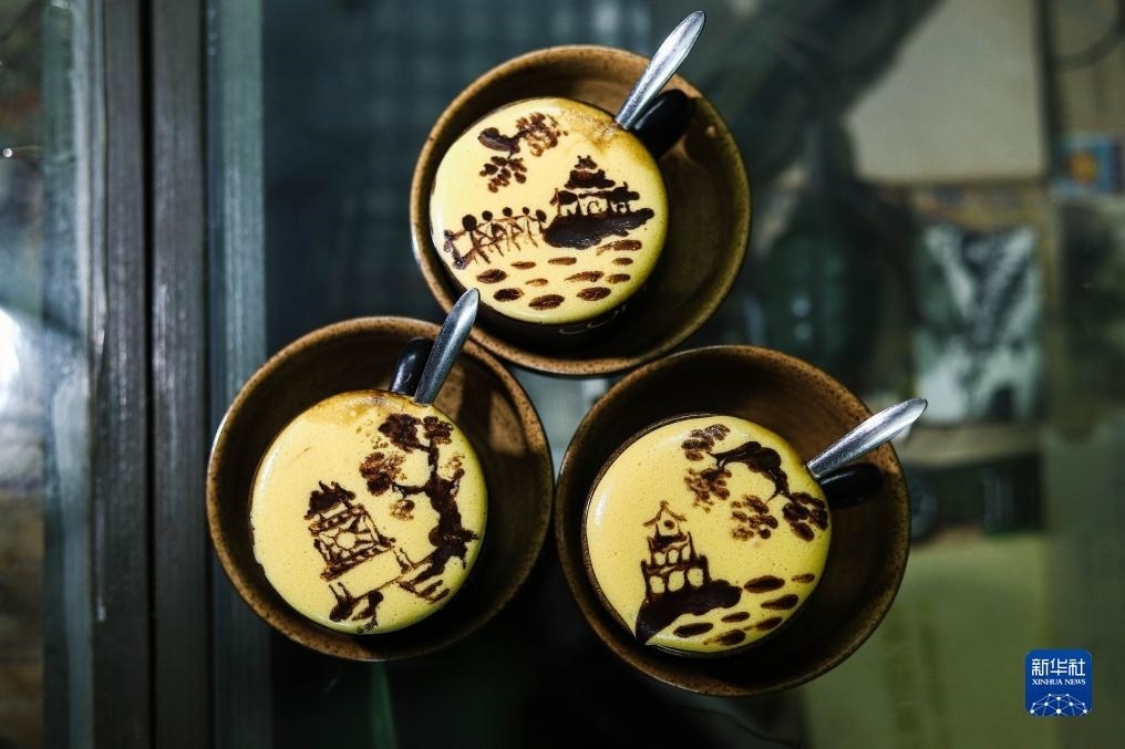 這是2023年7月22日在越南河內(nèi)一家咖啡店拍攝的繪制河內(nèi)風(fēng)光圖案的雞蛋咖啡。越南特色飲品雞蛋咖啡由蛋黃、糖、煉乳和咖啡等原料制成,其獨特的風(fēng)味受到當?shù)孛癖姾屯鈬慰拖矏邸?/p>