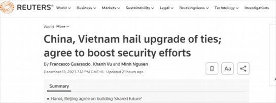 中國日報網(wǎng)12月14日電 12月12日,中國和越南共同宣布中越兩黨兩國關(guān)系新定位,在深化中越全面戰(zhàn)略合作伙伴關(guān)系基礎(chǔ)上,攜手構(gòu)建具有戰(zhàn)略意義的中越命運共同體。國際媒體對中越關(guān)系新定位進行了密集報道,認(rèn)為雙邊關(guān)系更加重要,中越兩黨兩國關(guān)系邁上新臺階。