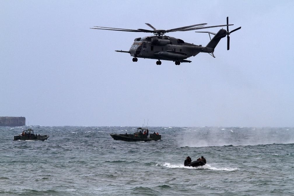 2013年9月20日,在菲律賓甲米地省,一架美軍CH-53E軍用直升機(jī)運(yùn)載美國和菲律賓士兵參加演習(xí)。新華社發(fā)(烏馬利攝)