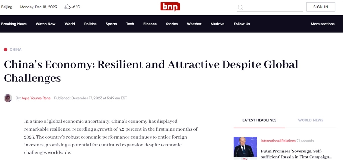美國(guó)新聞網(wǎng)站BNN Breaking報(bào)道認(rèn)為,在全球經(jīng)濟(jì)充滿不確定性的背景下,中國(guó)經(jīng)濟(jì)表現(xiàn)出驚人的韌性,2023年前三季增長(zhǎng)5.2%。