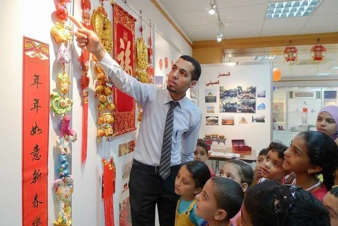一位埃及青年正認(rèn)真向圍在身邊的學(xué)生們講解中國傳統(tǒng)文化中的十二生肖。他身穿白色襯衫,系著條紋領(lǐng)帶,學(xué)生們仰起頭,專心致志地聆聽講解。這位埃及青年便是時年28歲的阿巴斯。作為開羅中國文化中心主任助理,他經(jīng)常在這里向埃及學(xué)生和民眾介紹中國的文房四寶和京劇臉譜,講解中國的傳統(tǒng)節(jié)日和風(fēng)景名勝,并帶領(lǐng)孩子們做手工,燈籠、風(fēng)箏和寫對聯(lián)往往是他們最喜愛的內(nèi)容。在當(dāng)年埃及的動蕩時局下,中國文化中心照常對外開放,各種活動有序開展。首屆大使杯“魅力埃及,多彩中國”攝影大賽作品展就吸引了上百名開羅市民前往參觀。