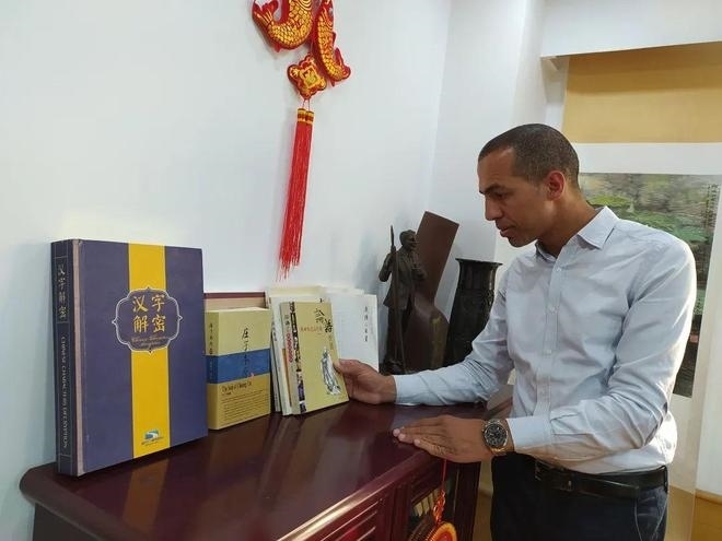 阿巴斯向記者介紹中國文化相關(guān)書籍。黃培昭攝