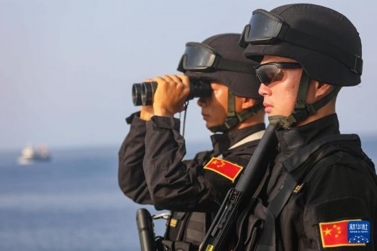 中國海軍第40批護航編隊岳陽艦特戰(zhàn)隊員在護航途中觀察警戒(2022年4月2日攝)。新華社發(fā)(唐文攝)