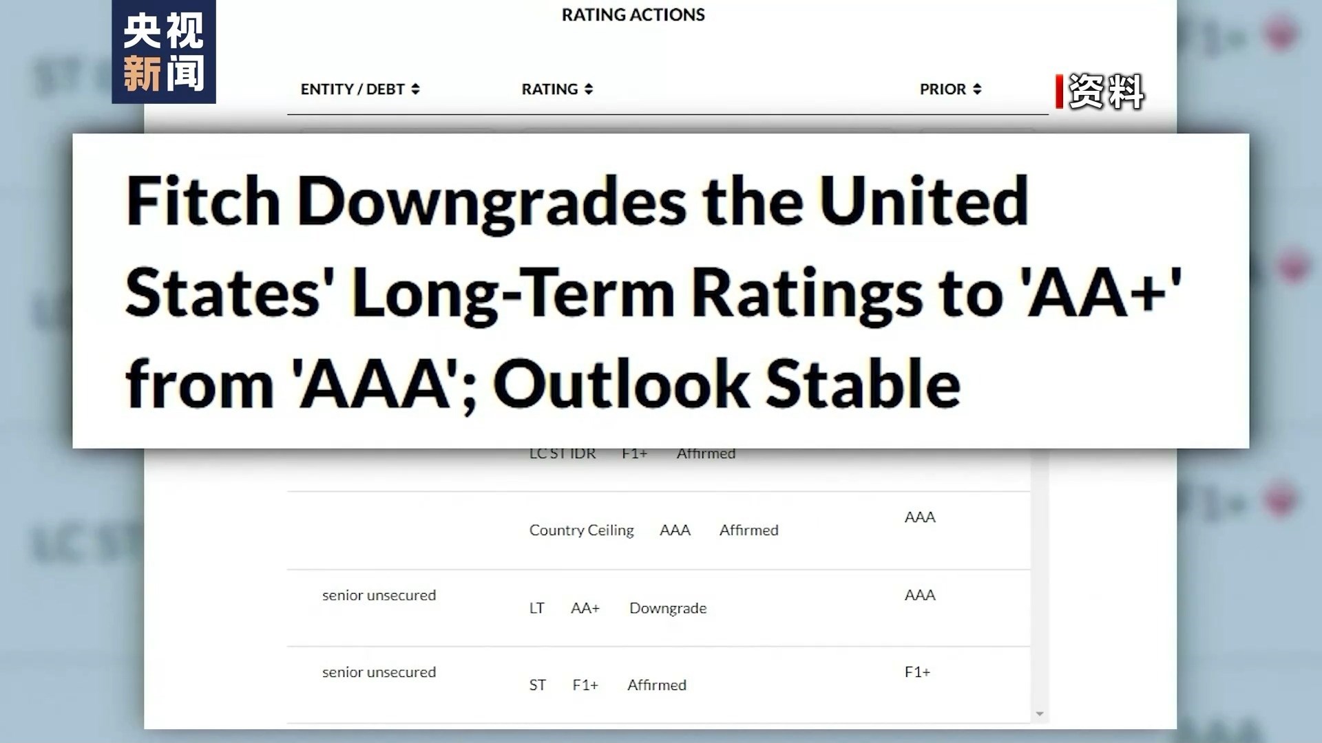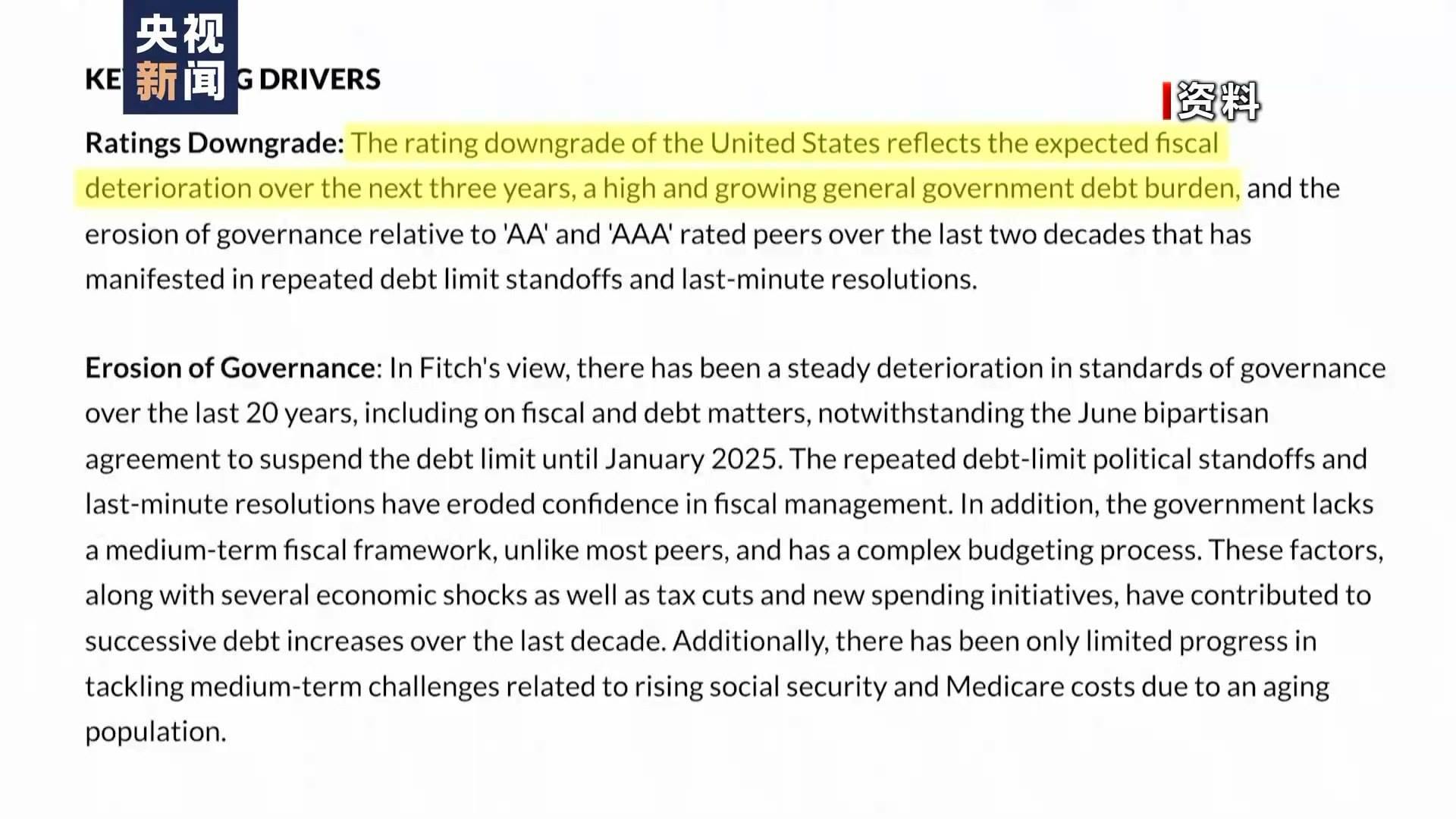到了2023年8月1日,國(guó)際評(píng)級(jí)機(jī)構(gòu)惠譽(yù)將美國(guó)長(zhǎng)期外幣發(fā)行人違約評(píng)級(jí)從AAA下調(diào)至AA+?;葑u(yù)當(dāng)天發(fā)表聲明說(shuō),下調(diào)美國(guó)信用評(píng)級(jí)主要由于美國(guó)政府債務(wù)負(fù)擔(dān)居高不下且不斷加重,未來(lái)3年財(cái)政狀況預(yù)計(jì)將持續(xù)惡化。