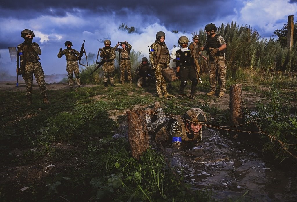 當(dāng)?shù)貢r(shí)間2023年7月15日,扎波羅熱地區(qū),烏克蘭女兵在不同的戰(zhàn)斗場景中進(jìn)行訓(xùn)練。