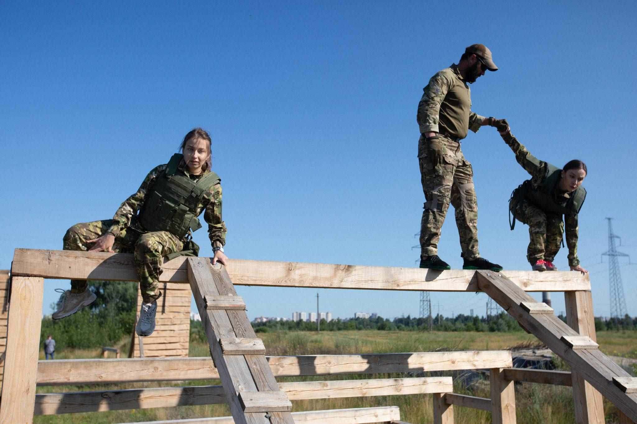 當(dāng)?shù)貢r(shí)間2023年7月12日,烏克蘭基輔,烏克蘭女兵身穿新款野戰(zhàn)服參加軍事訓(xùn)練。