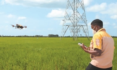 在烏干達(dá)卡隆古區(qū)盧卡亞鎮(zhèn)中億農(nóng)業(yè)園,作業(yè)員赫伯特·阿加巴操控植保無人機噴灑農(nóng)藥。新華社記者 張改萍攝