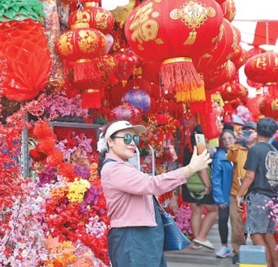 春節(jié)期間,印度尼西亞首都雅加達的中國城一派喜慶氣氛。圖為當(dāng)?shù)厥忻裨诮诌吷啼佔耘摹?/p>