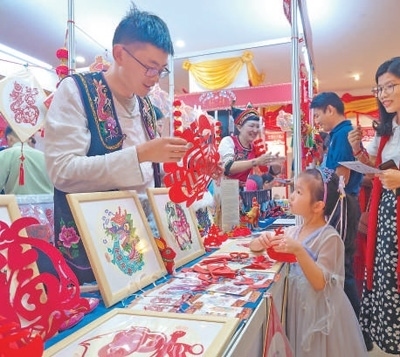 日前,在緬甸仰光舉辦的“歡樂春節(jié)·新春集市”活動現(xiàn)場,工作人員在展示剪紙作品。
