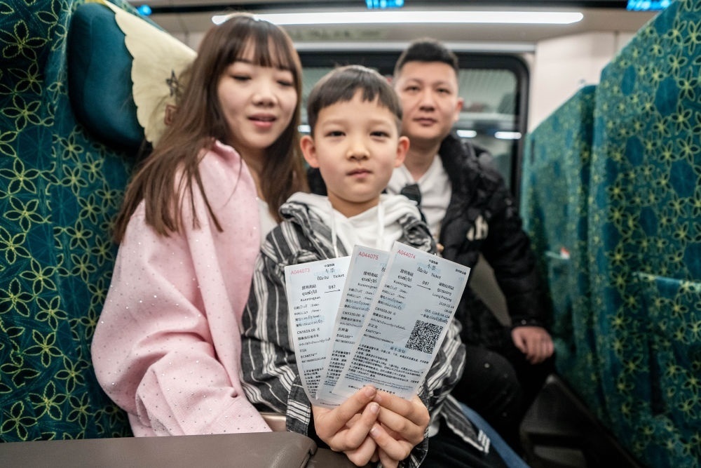2月14日,乘坐中老鐵路國(guó)際旅客列車前往老撾的游客展示購(gòu)買(mǎi)到的車票。