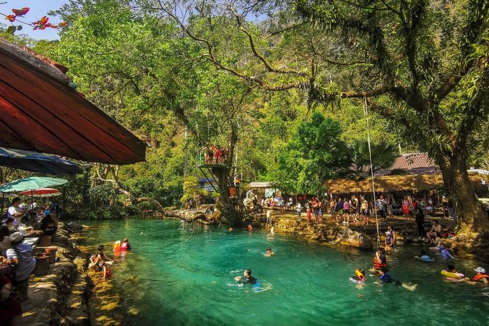 2月14日,中國(guó)游客在老撾萬(wàn)榮藍(lán)色瀉湖游玩。
