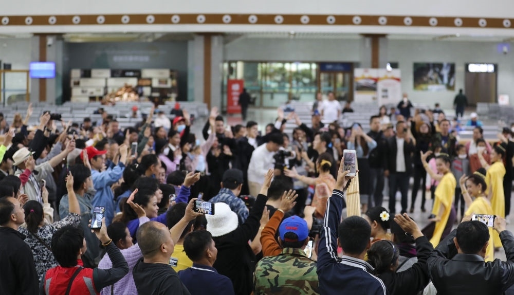 1月26日,旅客在中老鐵路萬(wàn)象站候車廳觀看當(dāng)?shù)貍鹘y(tǒng)舞蹈表演。