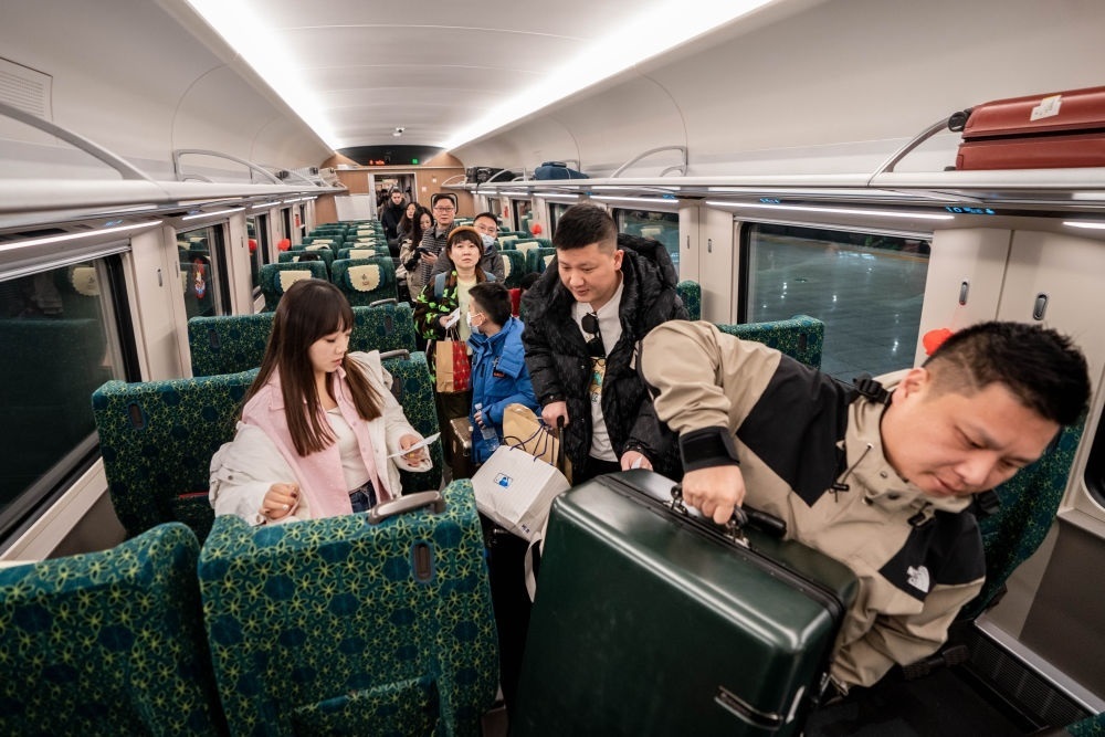 2月14日,乘坐中老鐵路國(guó)際旅客列車前往老撾的游客在列車上搬運(yùn)行李。