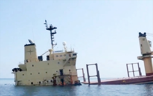 這張拍攝日期不明的照片顯示了英國貨輪“魯比馬爾”號(hào)沉沒前的景象。新華社發(fā)(也門政府供圖)