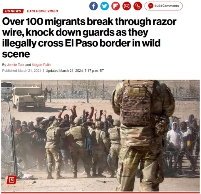 中新網(wǎng)3月22日電 綜合外媒報道,當(dāng)?shù)貢r間21日,在得克薩斯州邊境墻附近,有上百名非法移民沖破鐵絲網(wǎng)試圖非法進入美國。他們撞倒得州國民警衛(wèi)隊成員,試圖越過美墨邊境,場面一度十分混亂。