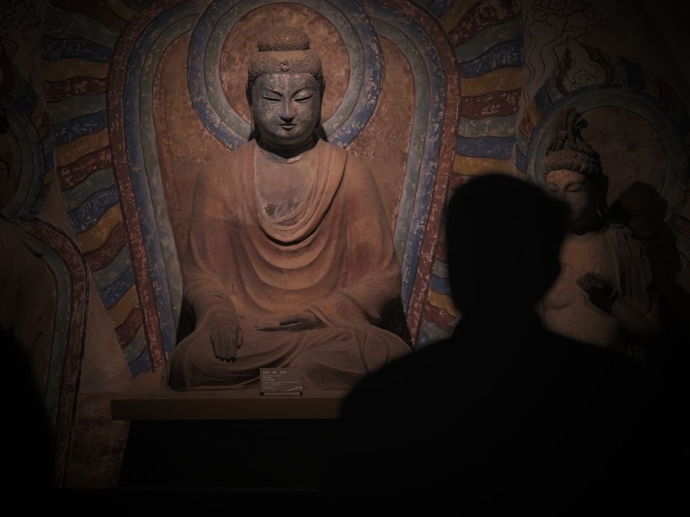 3月11日,游客在甘肅省博物館觀看展出的唐代佛像。新華社記者趙宇攝