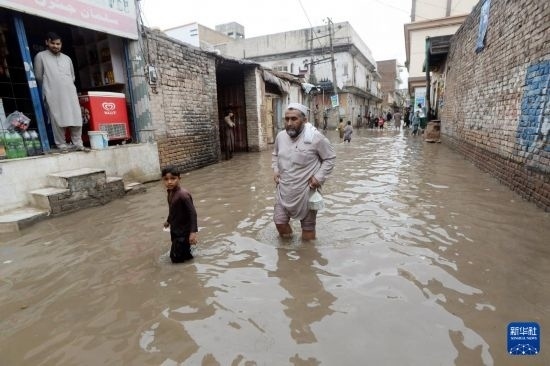 4月15日,在巴基斯坦西北部城市白沙瓦,人們涉水前行。新華社發(fā)(奧馬爾·卡尤姆攝)