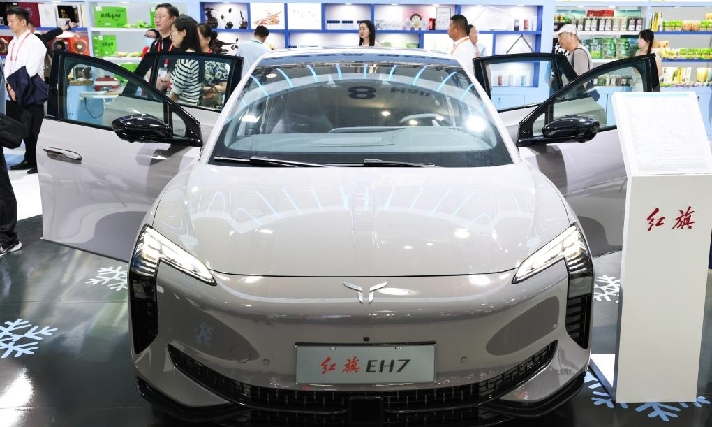 ?這是在第四屆中國國際消費(fèi)品博覽會(huì)上展出的紅旗新能源汽車(2024年4月13日攝)。新華社記者楊冠宇攝