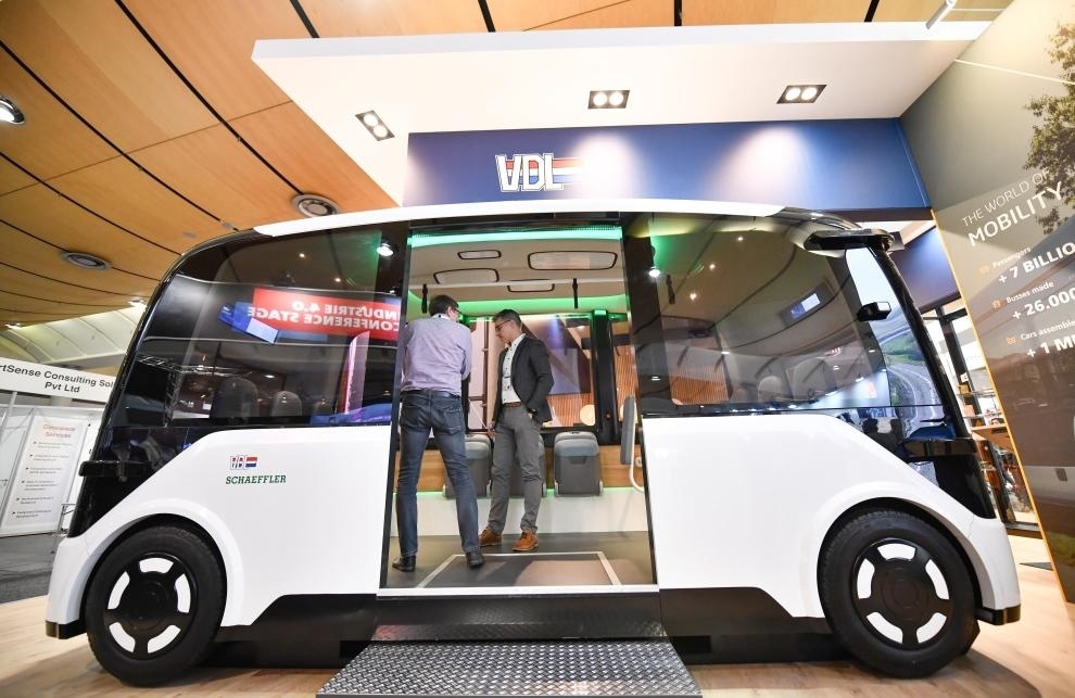 ?4月23日,人們在德國漢諾威工博會(huì)上參觀一款無人駕駛汽車。新華社記者任鵬飛攝