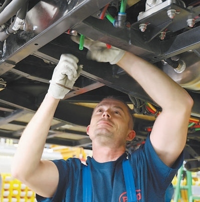 位于匈牙利科馬羅姆的比亞迪電動大巴工廠內(nèi),工人正在作業(yè)。本報記者 顏 歡攝