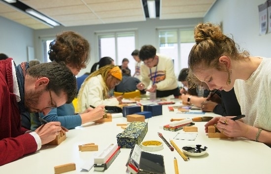 5月2日至5月6日,華東師大“漢字走進法國校園”工作坊活動在新里昂中法大學、熱納斯鎮(zhèn)路易·萊普林斯—林蓋中學、里昂二大與里昂國際學校相繼舉行。當?shù)卮笾行W生和市民參觀了由華東師大美術(shù)學院書法篆刻專業(yè)4位老師和43位在校研究生創(chuàng)作的書法篆刻作品,首次動手體驗了篆刻的樂趣。