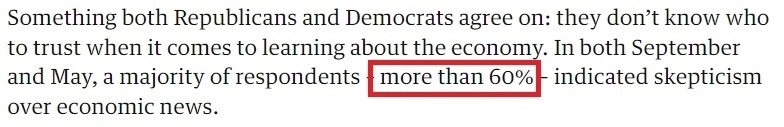 而無論是共和黨人還是民主黨人,幾乎所有受訪者都同意的一點是:在了解經(jīng)濟(jì)情況方面,他們不知道該相信誰。民調(diào)顯示,超六成美國人對經(jīng)濟(jì)新聞的真實性表示質(zhì)疑。