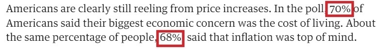 在《衛(wèi)報》發(fā)布的民意調(diào)查中,有70%的受訪者表示,他們最大的經(jīng)濟(jì)擔(dān)憂是生活成本;大約同樣比例的人(68%)說,通貨膨脹是他們最關(guān)心的問題。