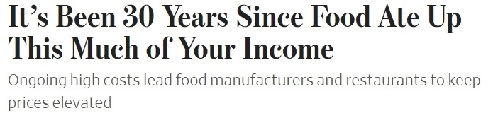 《華爾街日報》報道稱,持續(xù)的高成本導(dǎo)致食品制造商和餐館繼續(xù)抬高價格,“食物支出‘吃掉’這么多收入,已經(jīng)是30年前的事”。