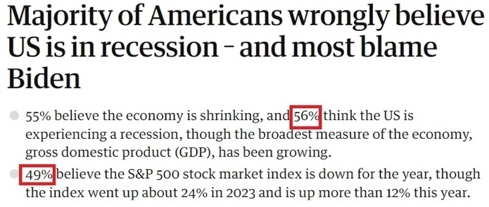 眼下美國的經(jīng)濟(jì)現(xiàn)狀,被經(jīng)濟(jì)學(xué)家們稱為“氛圍衰退”。這個詞最早由網(wǎng)紅經(jīng)濟(jì)評論員凱拉 斯坎倫創(chuàng)造,用以描述人們對經(jīng)濟(jì)狀況存在的悲觀情緒,即便是表現(xiàn)良好的經(jīng)濟(jì)統(tǒng)計數(shù)據(jù)也無法消除這種悲觀情緒。