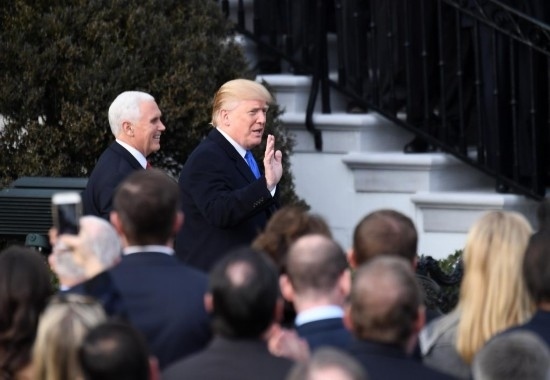 2017年12月20日,在美國華盛頓白宮,時(shí)任美國總統(tǒng)特朗普(右)和副總統(tǒng)彭斯準(zhǔn)備就國會(huì)通過稅改法案發(fā)表講話。新華社記者殷博古攝