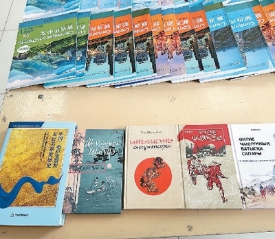 在孔子學(xué)院文化活動(dòng)室桌面上,擺著幾本用哈薩克語翻譯的中國書籍,《邊城》《駱駝祥子》《長(zhǎng)春真人西游記》《陰山汪古》等等。