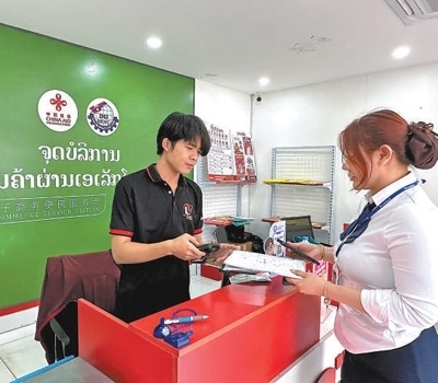 在老撾首都萬象市一處便民服務(wù)點,當(dāng)?shù)鼐用袷杖≡陔娚唐脚_選購的商品快遞。本報記者 孫廣勇攝