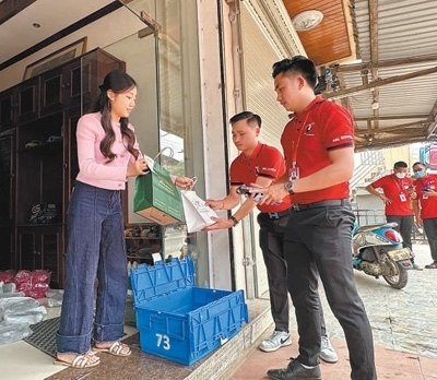 中午時分,記者來到老撾首都萬象市塔鑾附近的一處便民服務(wù)點。摩托車來來往往,不時有當(dāng)?shù)鼐用駚泶耸瞻l(fā)電商商品。工作人員正忙著將收到的商品掃描、稱重、歸類、打包,趕在傍晚送到轉(zhuǎn)運中心發(fā)往目的地。